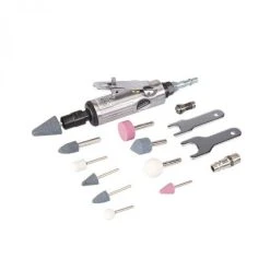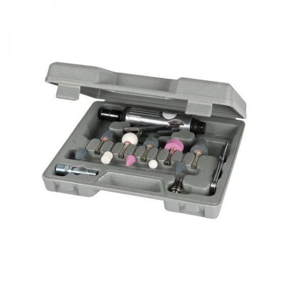 Mallette 16 pièces : kit meuleuse droiteComposition: – 2 mandrins 3mm et 6mm- 1 clé de serrage- 5 meules Ø 3 mm – 5 meules Ø 6mm – 1 raccord